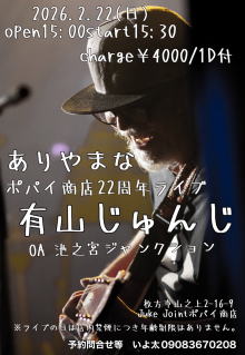 枚方 「ポパイ商店」 『ありやまなポパイ商店22周年LIVE♪』 OPEN/15:00 START/15:30 ¥4.000 (1ドリンク付) ![]() |