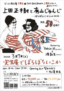 福井県鯖江市上河端町16-43 | 問い合わせ 090-6271-1555 (クメダ) (14:00~17:00、20:00以降) 主催 びーどろ実生庵 JAZZ BAR Breath *前売りは両店にて |